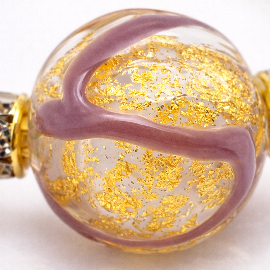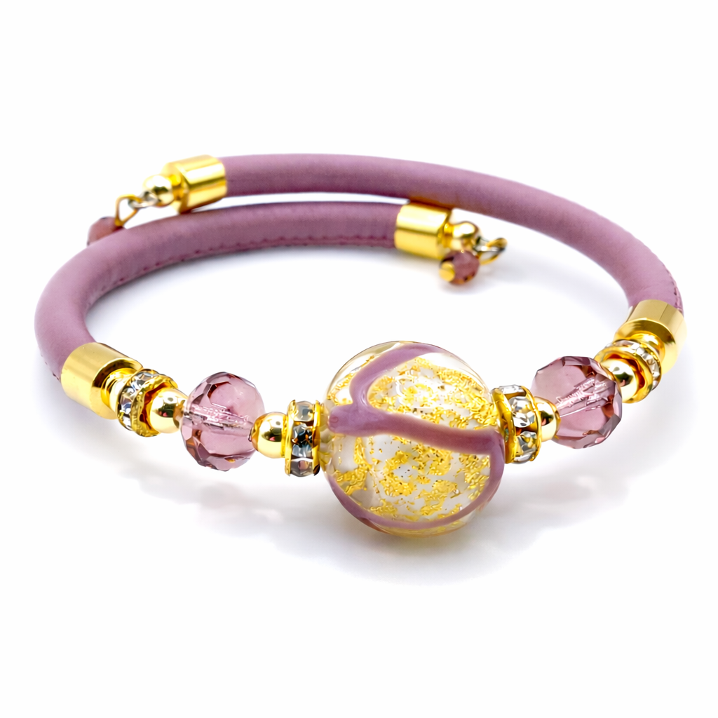 16 mm-es  muránói üveggyöngy 24 kt aranyfólia díszítéssel, kézzel készült – minden gyöngy egyedi. Valódi toszkán bőrből készült univerzális méretű karkötő, amely bármilyen csuklón viselhető. Könnyen felvehető: nincs csatja, egy harmonikus acél belső szerkezet tartja mindig a csuklón a karkötőt. Hipoallergén fém alkatrészek. Ajándékdoboz és hitelesség garancia tartozik hozzá.