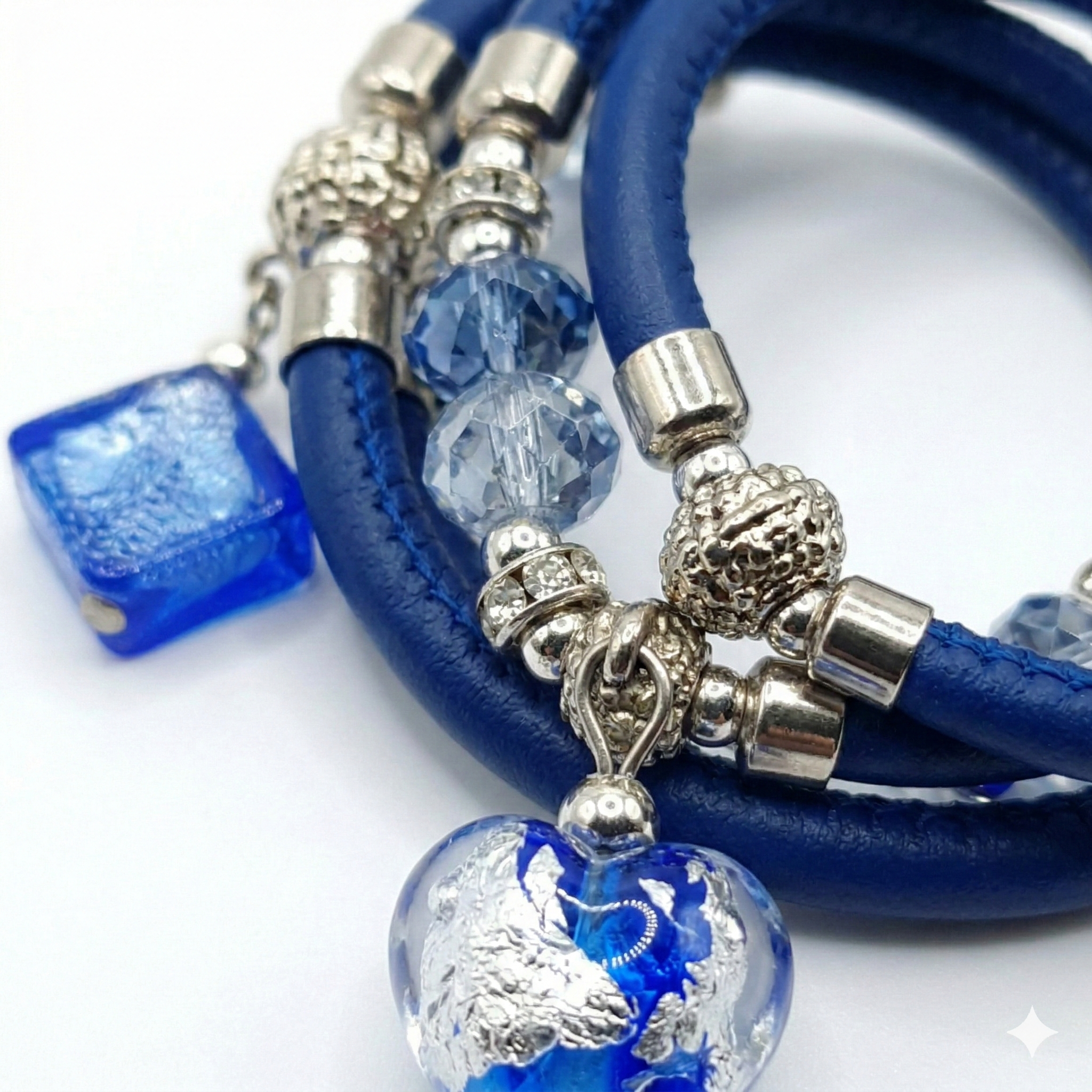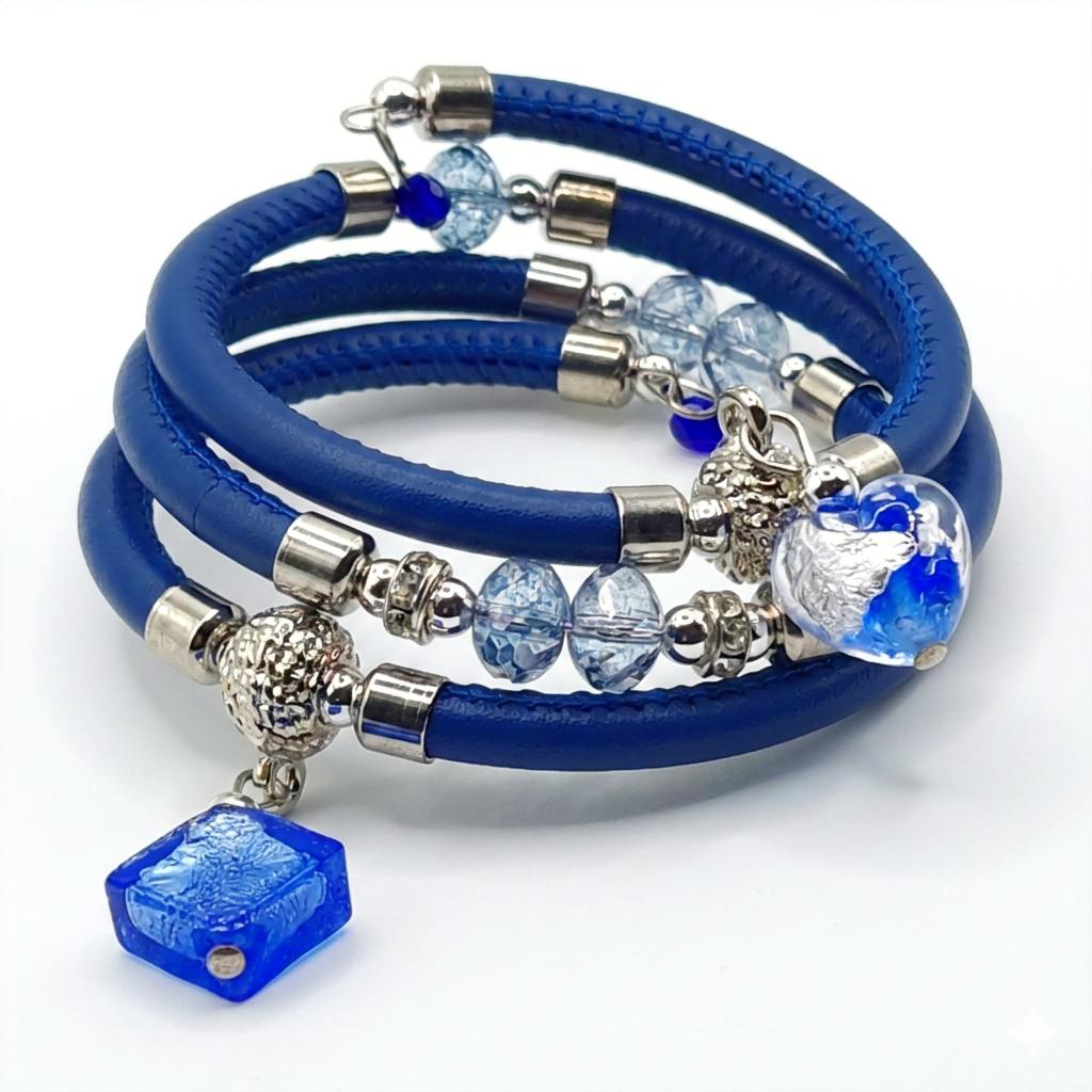 Muránói üveggyöngyökkel díszített karkötő, eredeti toszkán bőrszíjjal, melyet Swarovski kristályok tesznek még ragyogóbbá. Made in Italy.