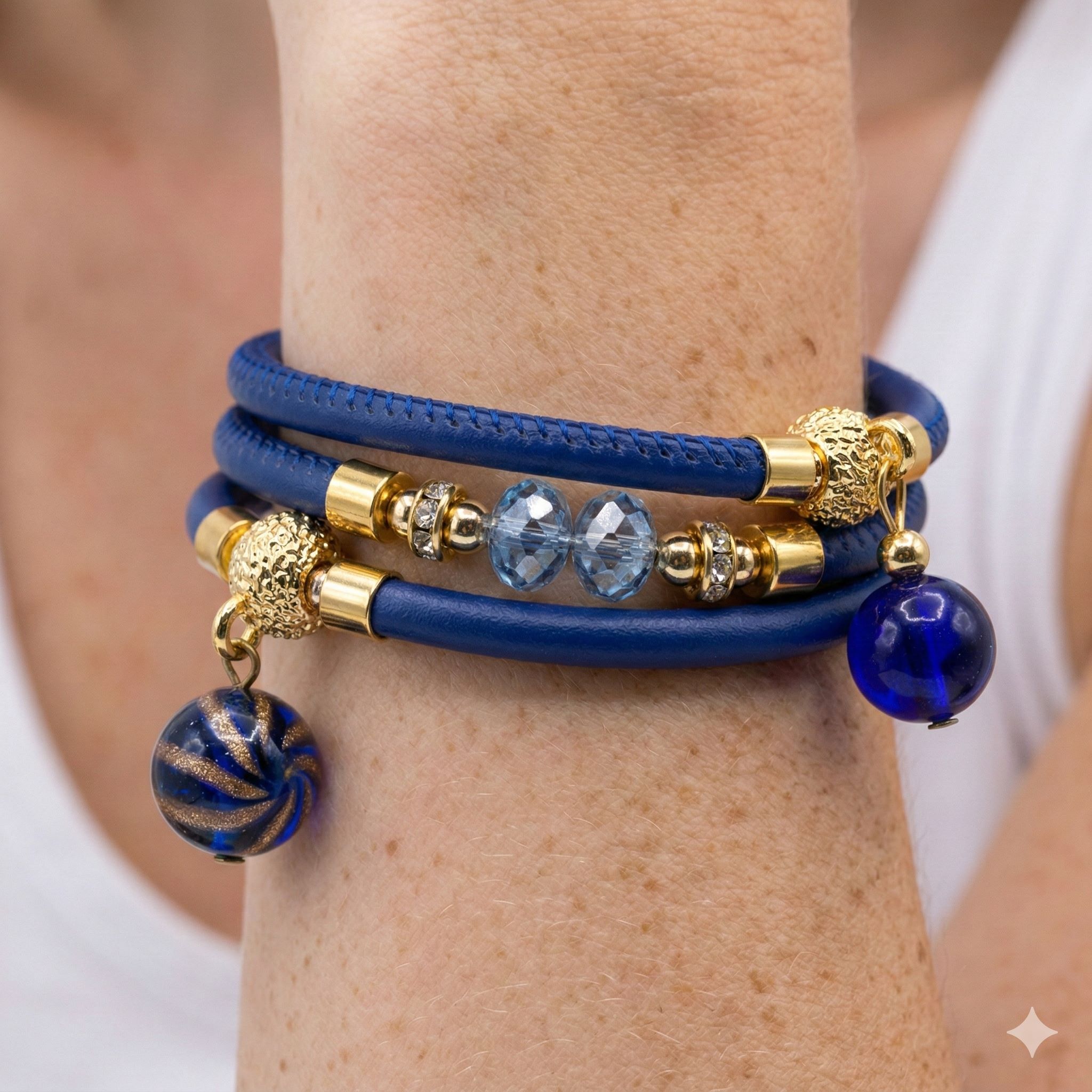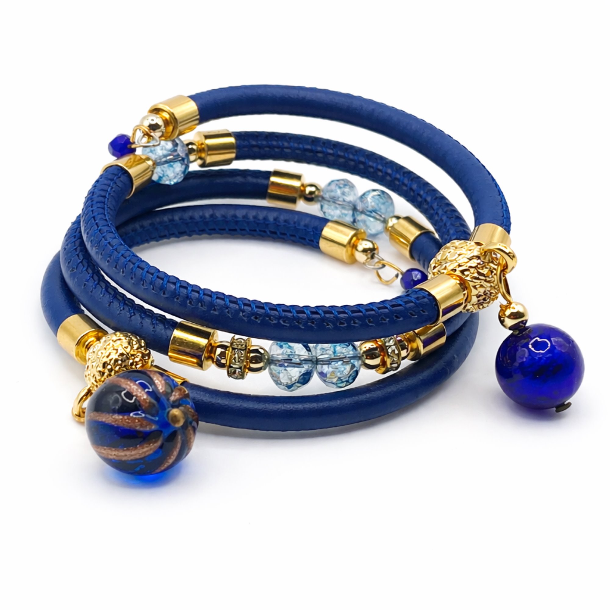 Muránói üveggyöngyökkel díszített karkötő, eredeti toszkán bőrszíjjal, melyet Swarovski kristályok tesznek még ragyogóbbá. Made in Italy.