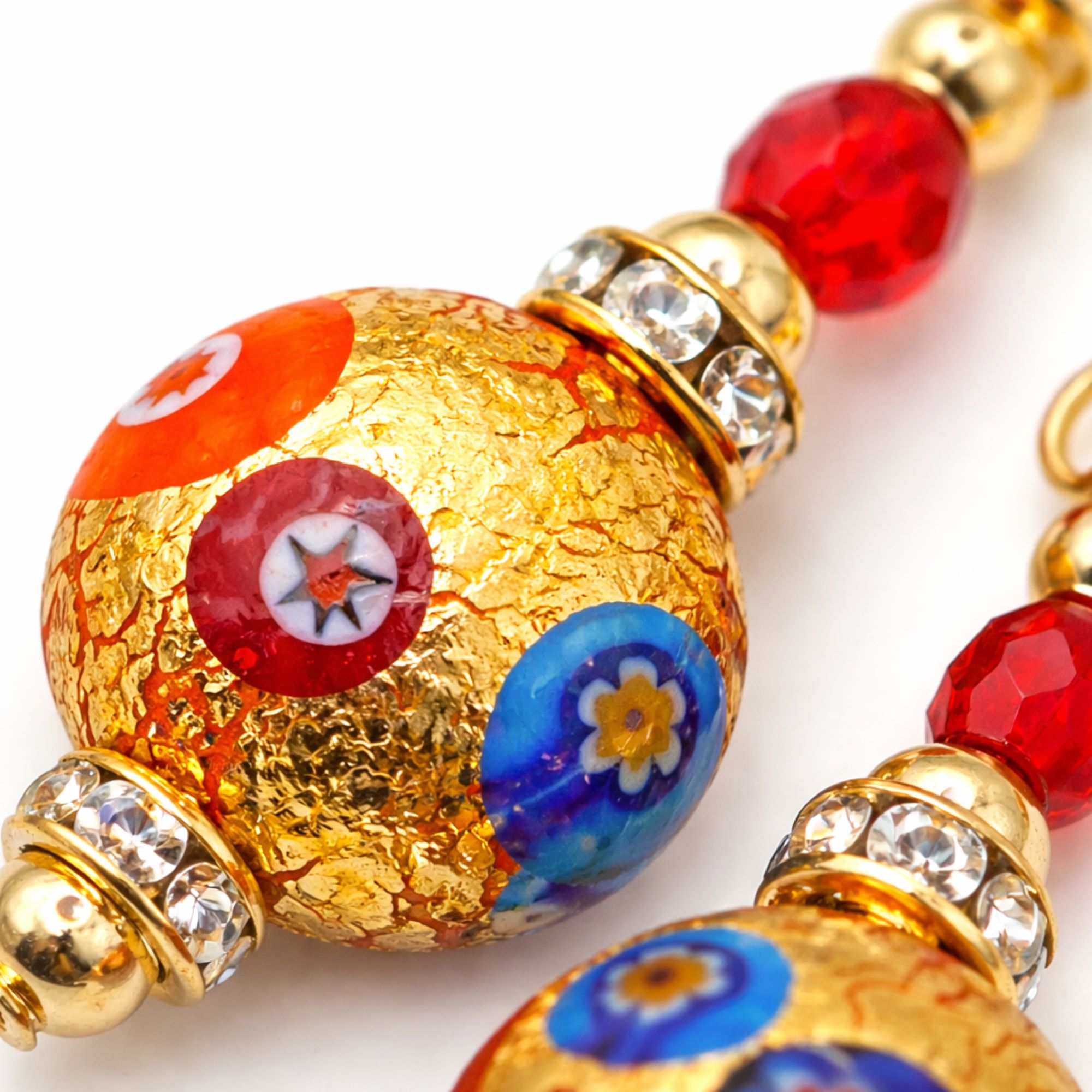 Muránói üveggyöngy fülbevaló, millefiori mintákkal. Kézzel készített darab. Hossza 5 cm, 24 kt arannyal bevont hipoallergén orvosi ezüst kapoccsal.