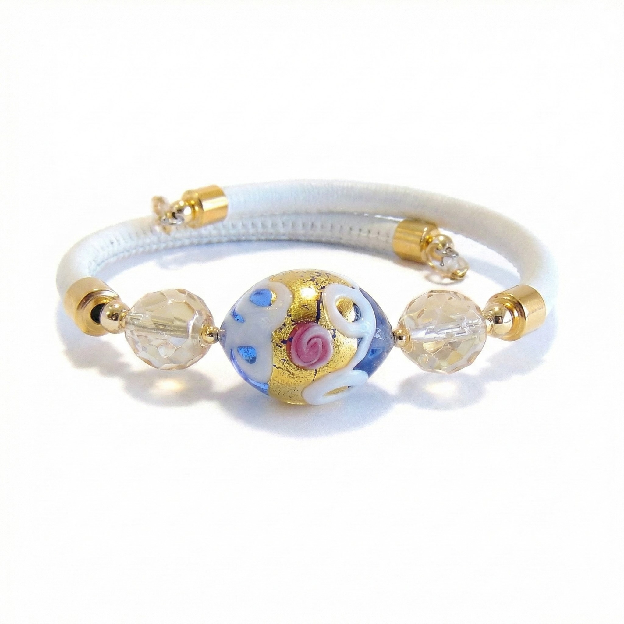 Muránói üveggyöngyökkel díszített karkötő, eredeti toszkán bőrszíjjal, melyet Swarovski kristályok tesznek még ragyogóbbá. Made in Italy.