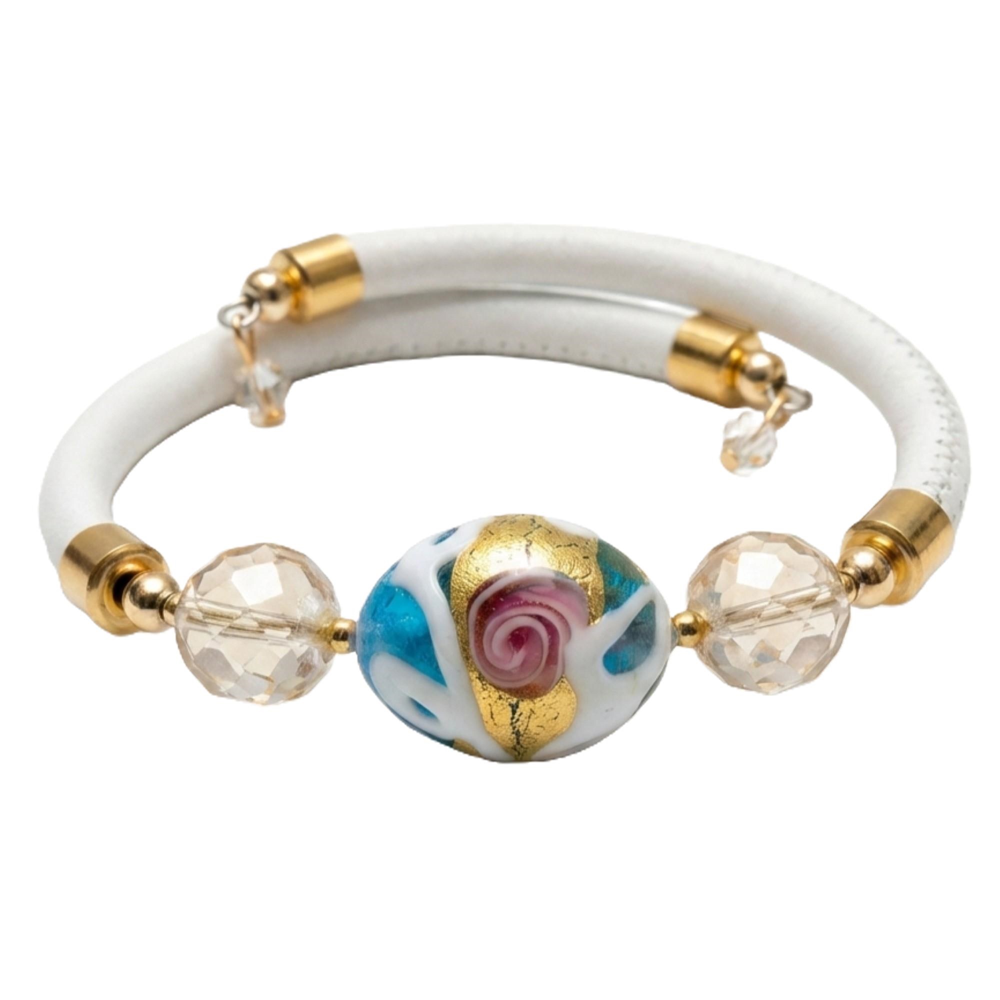 Muránói üveggyöngyökkel díszített karkötő, eredeti toszkán bőrszíjjal, melyet Swarovski kristályok tesznek még ragyogóbbá. Made in Italy.