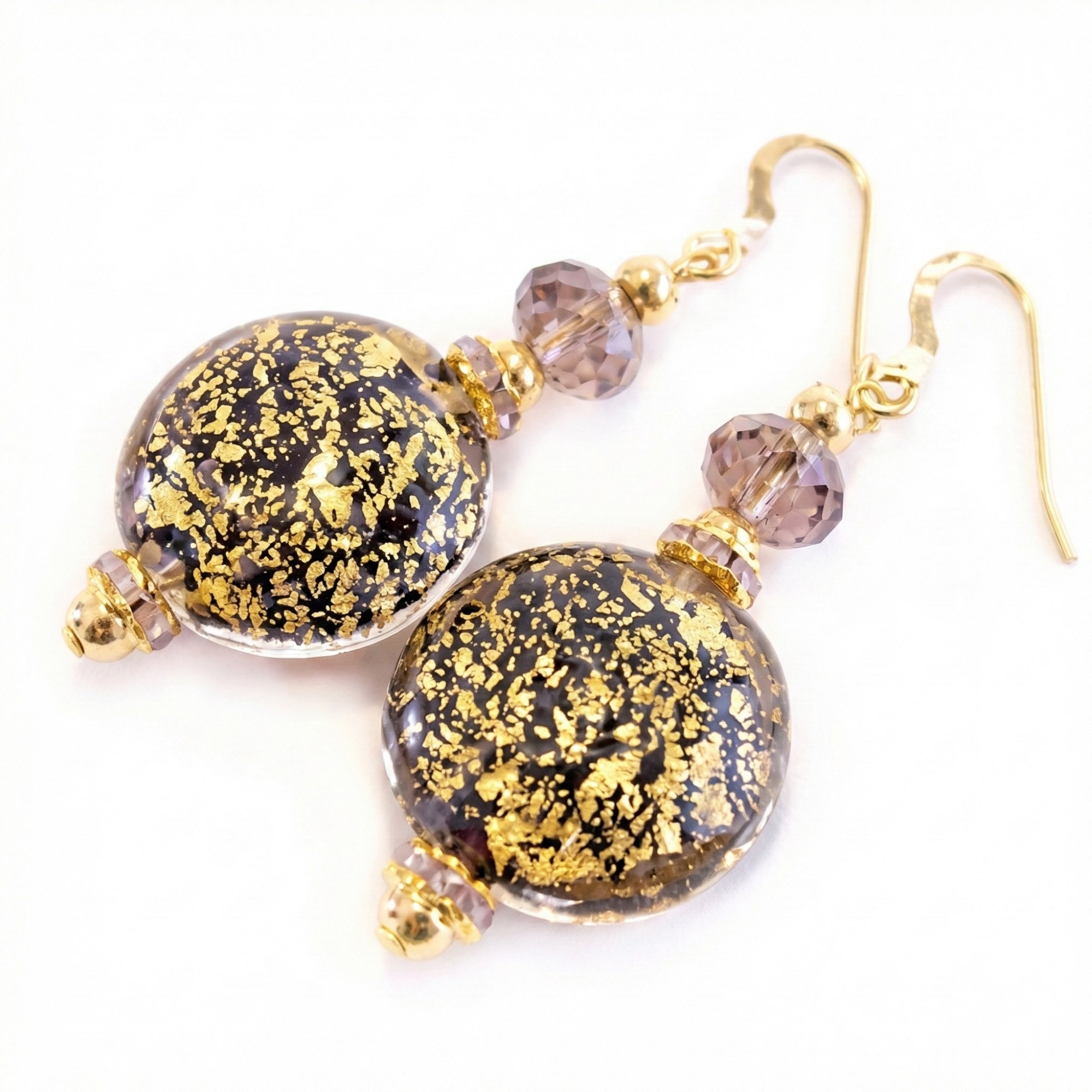 Muránói üveggyöngy fülbevaló. Kézi készítésű; minden gyöngydarab egyedi, kidolgozásukban különböznek egymástól. 24 kt arannyal bevont hipoallergén orvosi ezüst kapoccsal. A fülbevalók hossza 5 cm, súlyuk egyenként 7 g. Az ékszerdarabot ajándékdobozzal szállítjuk és hitelességi garanciát mellékelünk hozzá.