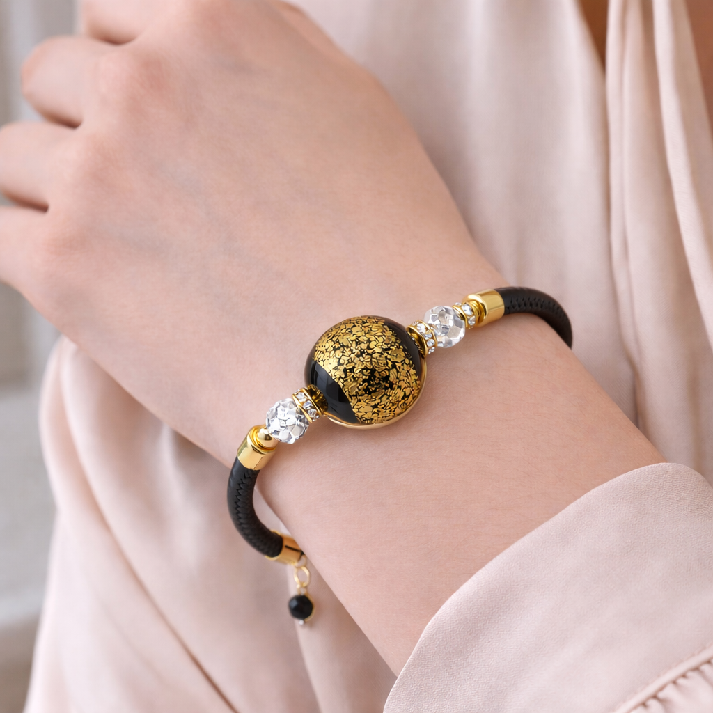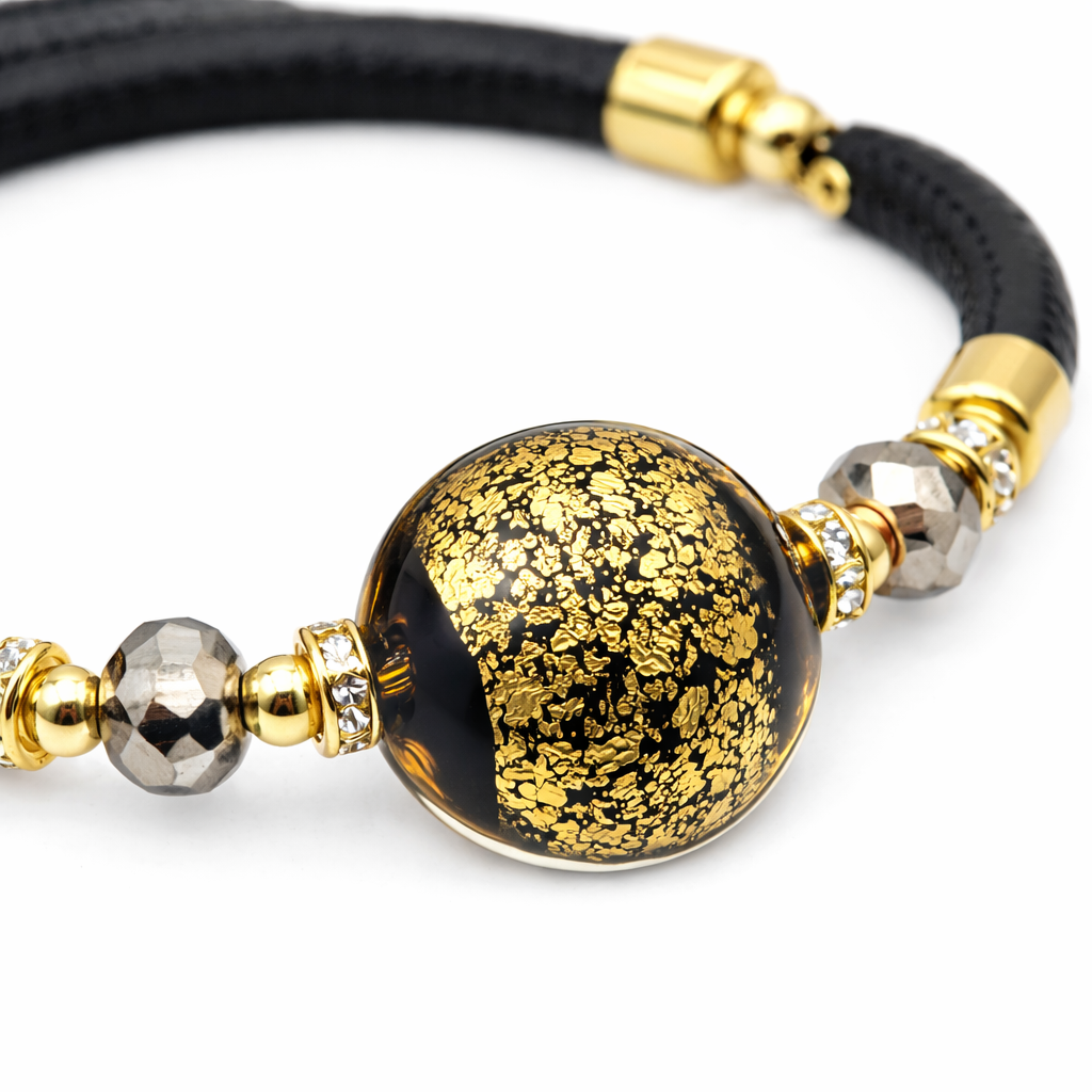 Muránói üveggyöngyökkel díszített karkötő, eredeti toszkán bőrszíjjal, Made in Italy. Egy autentikus ékszer, amely nemcsak csodálatos látványt nyújt, de viselése örömet is szerez Az ékszer a muránói kézművesség kiváló hagyományai szerint készült, amely a szépség és a minőség megteremtésével életben tartja Velence történelmét. Egyedisége lehetővé teszi, hogy eredeti alkotások készüljenek a különleges stílust kereső hölgyek részére. A minőség mindig az első helyen áll, minden darab kézzel készül olyan technikákkal, amelyek Muránóban születtek és több mint ezer éve öröklődnek.