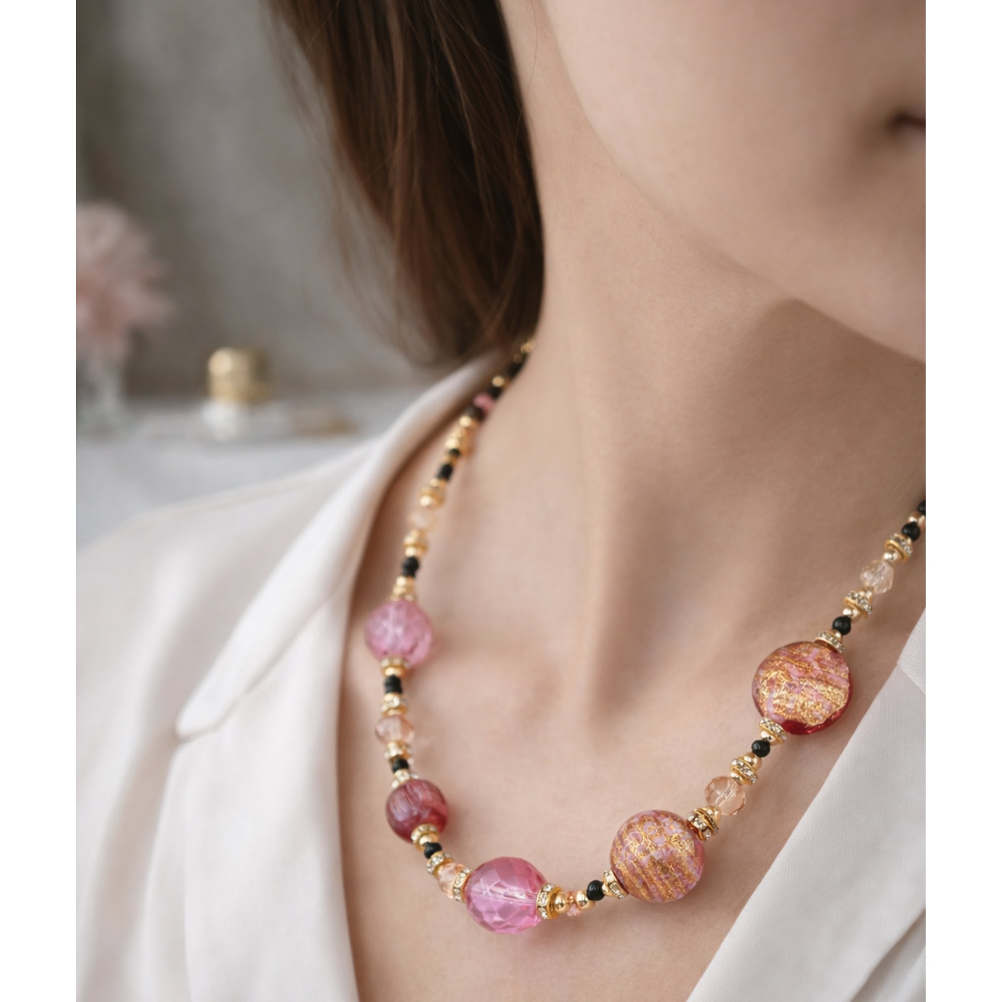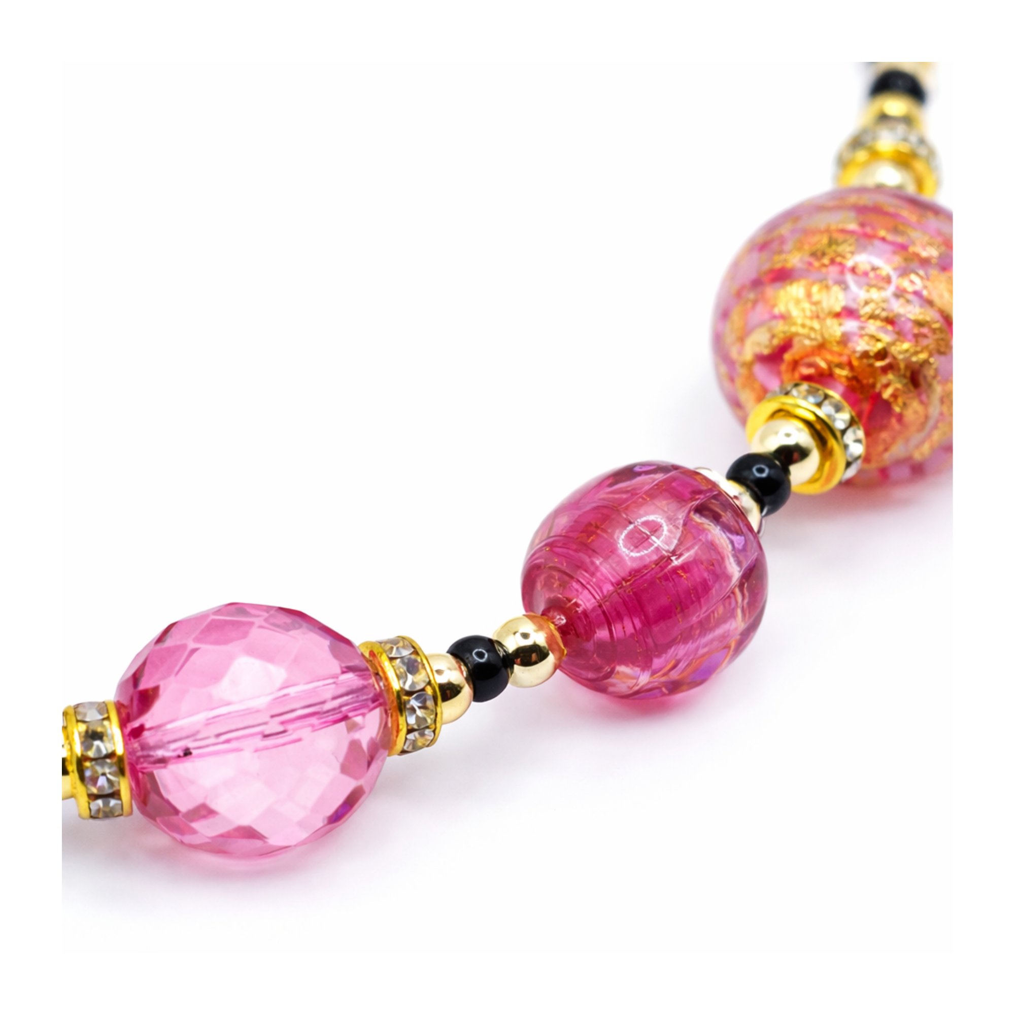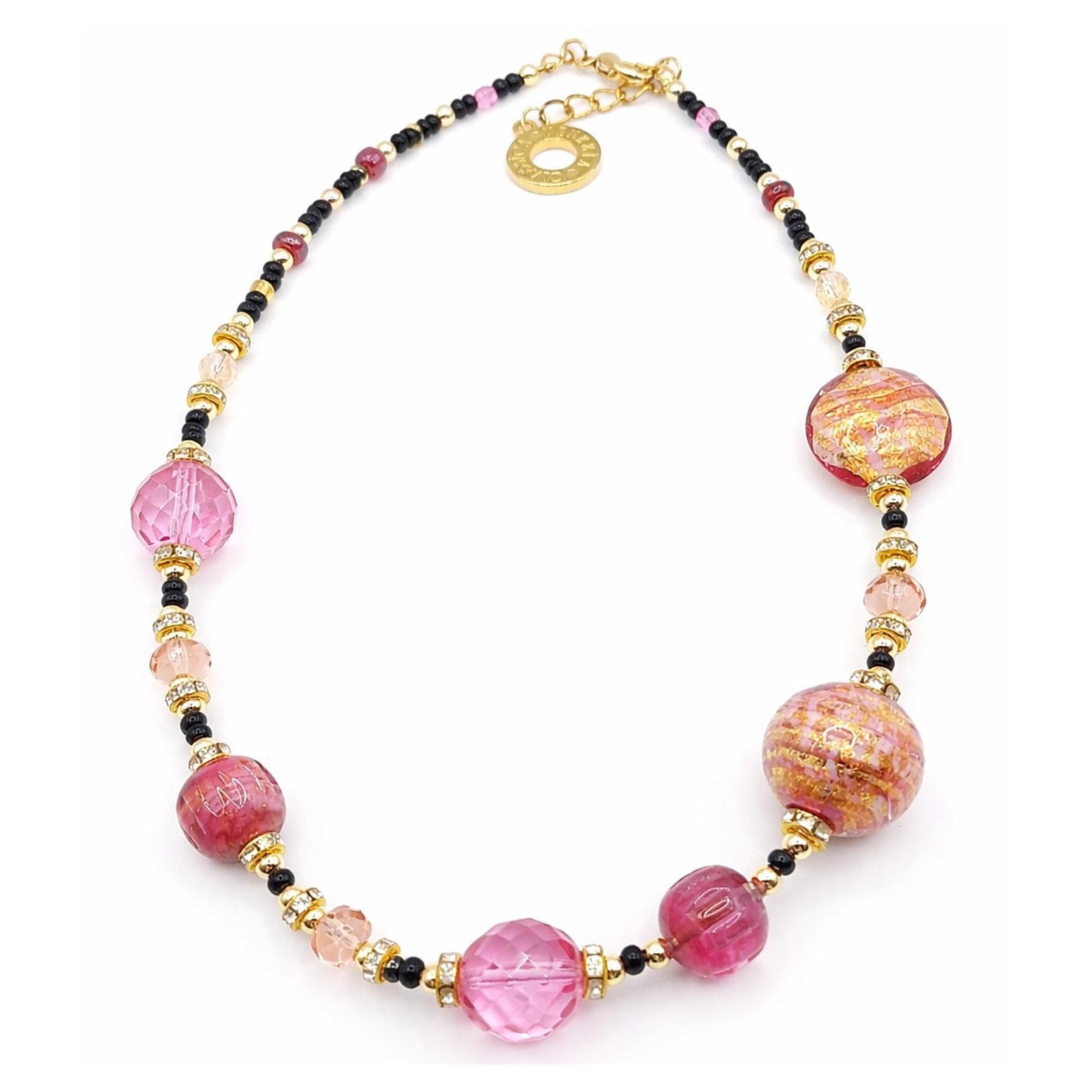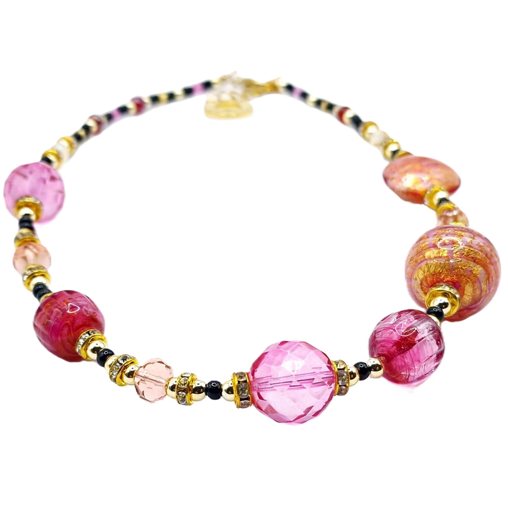 44 cm-es rövid nyaklánc eredeti muránói üveggyöngyökkel, Made in Italy. Egy autentikus ékszer, amely gyönyörű látványt nyújt és viselése is különleges élményt ad. A muránói kézművesség legnemesebb hagyományai szerint készült, amely a szépség és a minőség megteremtésével őrzi Velence történelmét.