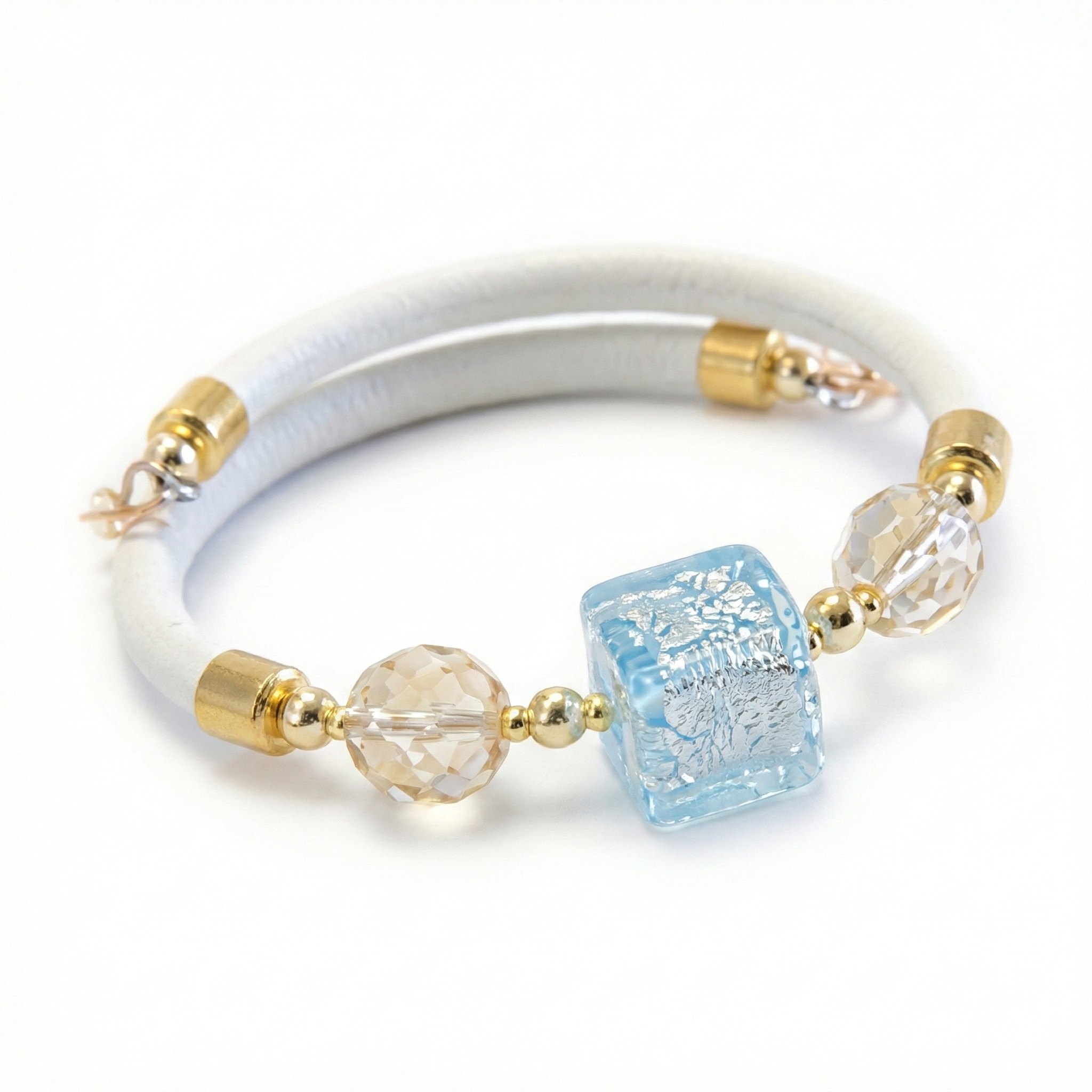 Muránói üveggyöngyökkel díszített karkötő, eredeti toszkán bőrszíjjal, melyet Swarovski kristályok tesznek még ragyogóbbá. Made in Italy.
