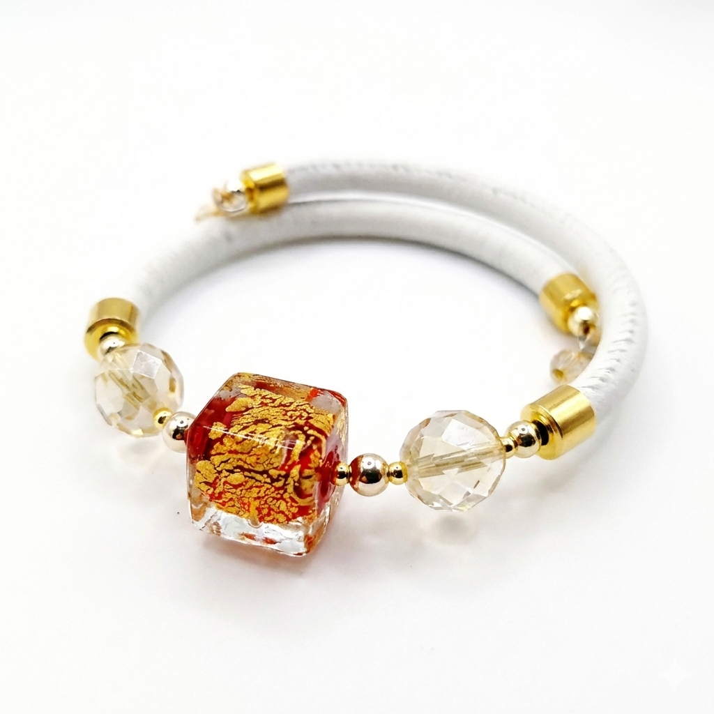 20 mm-es  muránói üveggyöngy 24 kt aranyfólia díszítéssel. Kézi készítésű; minden gyöngydarab egyedi, kidolgozásukban különböznek egymástól. Valódi toszkán bőrből készült univerzális méretű karkötő, amely bármilyen csuklón viselhető. Könnyen felvehető: nincs csatja, egy harmonikus acél belső szerkezet tartja mindig a csuklón a karkötőt. Hipoallergén fém alkatrészek. Ajándékdoboz és hitelesség garancia tartozik hozzá.