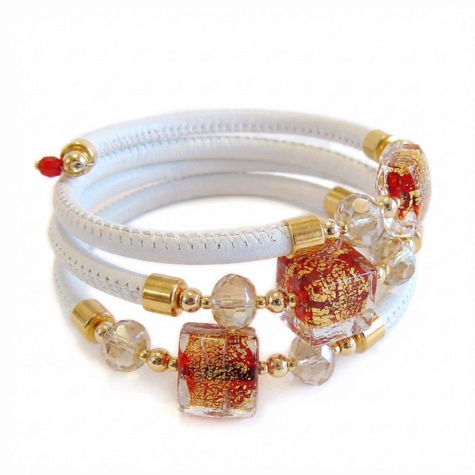Muránói üveggyöngyökkel díszített karkötő, eredeti toszkán bőrszíjjal, melyet Swarovski kristályok tesznek még ragyogóbbá. Made in Italy.