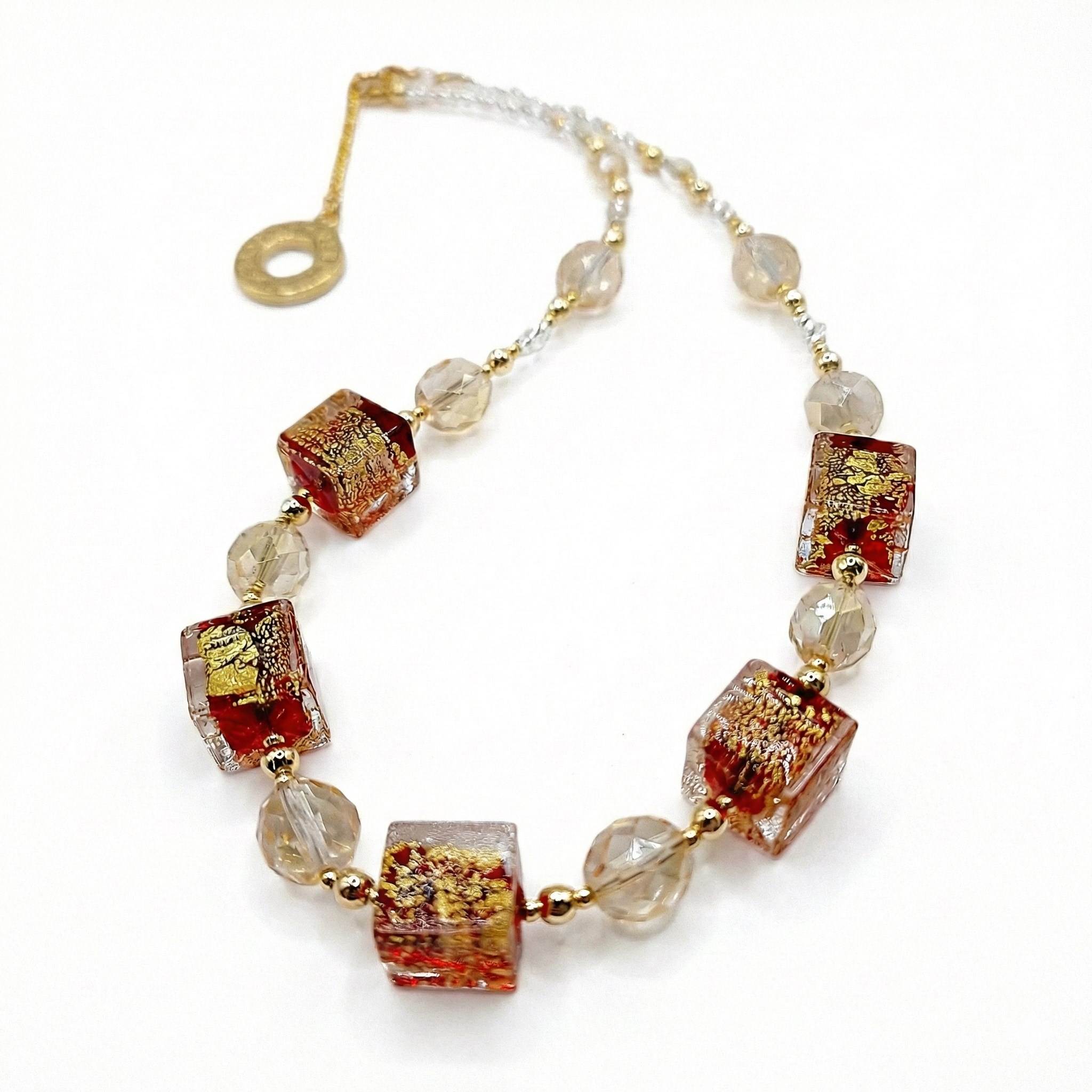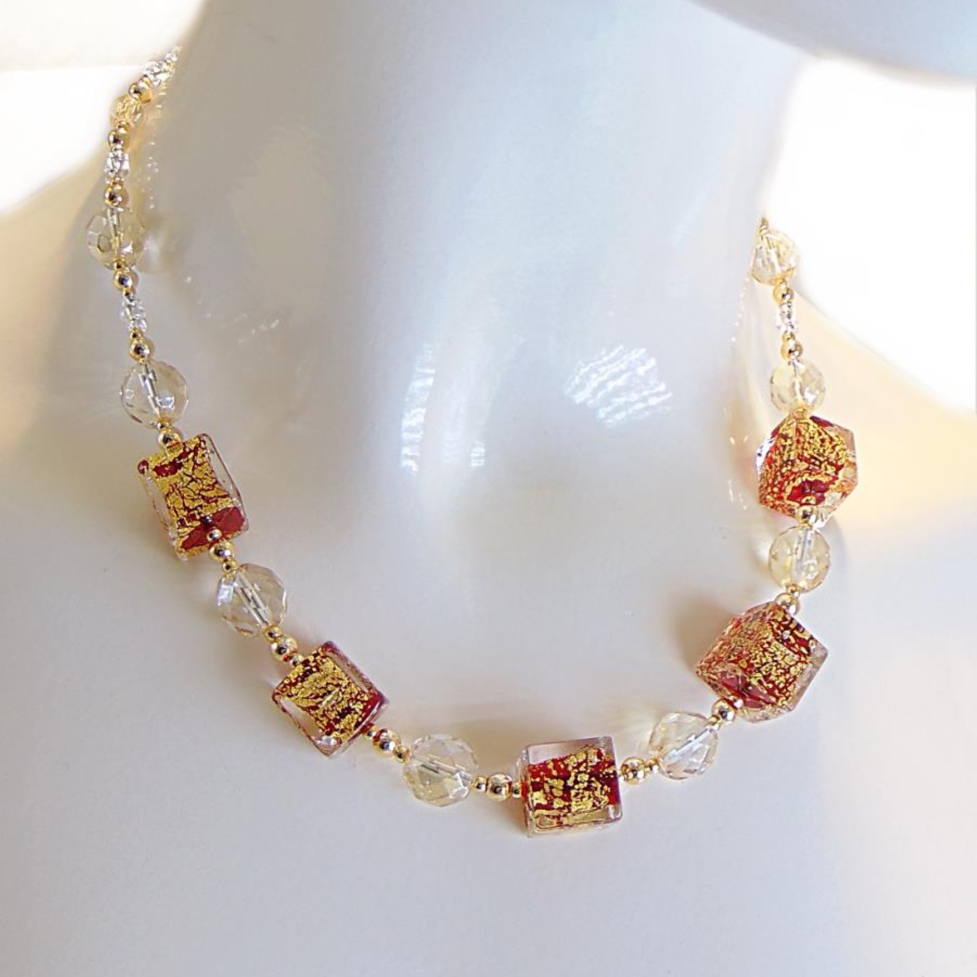 45 cm-es rövid nyaklánc eredeti muránói üveggyöngyökkel, Swarovski kristályokkal. Made in Italy. Egy autentikus ékszer, amely gyönyörű látványt nyújt és viselése is különleges élményt ad. A muránói kézművesség legnemesebb hagyományai szerint készült, amely a szépség és a minőség megteremtésével őrzi Velence történelmét.