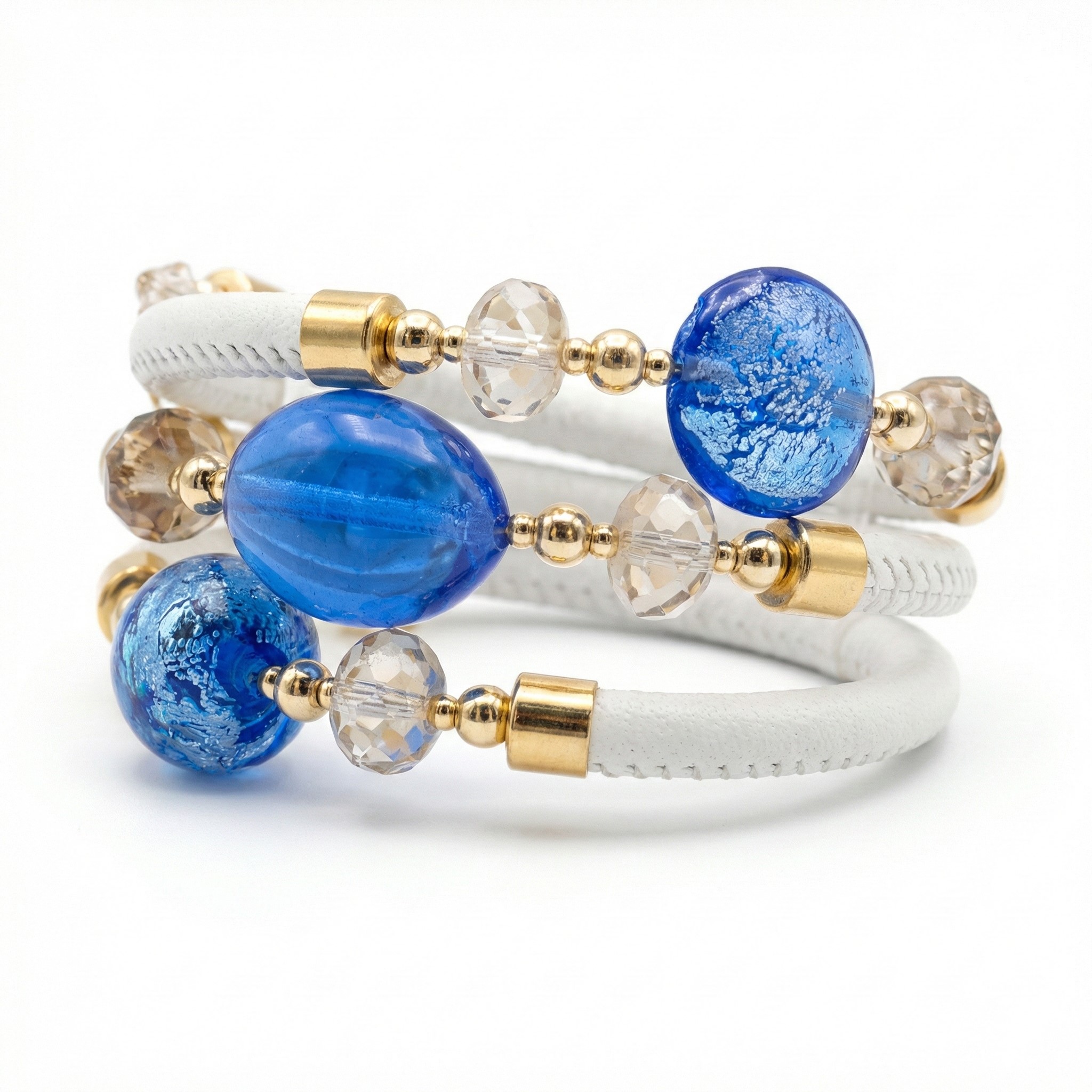 Muránói üveggyöngyökkel díszített karkötő, eredeti toszkán bőrszíjjal, melyet Swarovski kristályok tesznek még ragyogóbbá. Made in Italy.