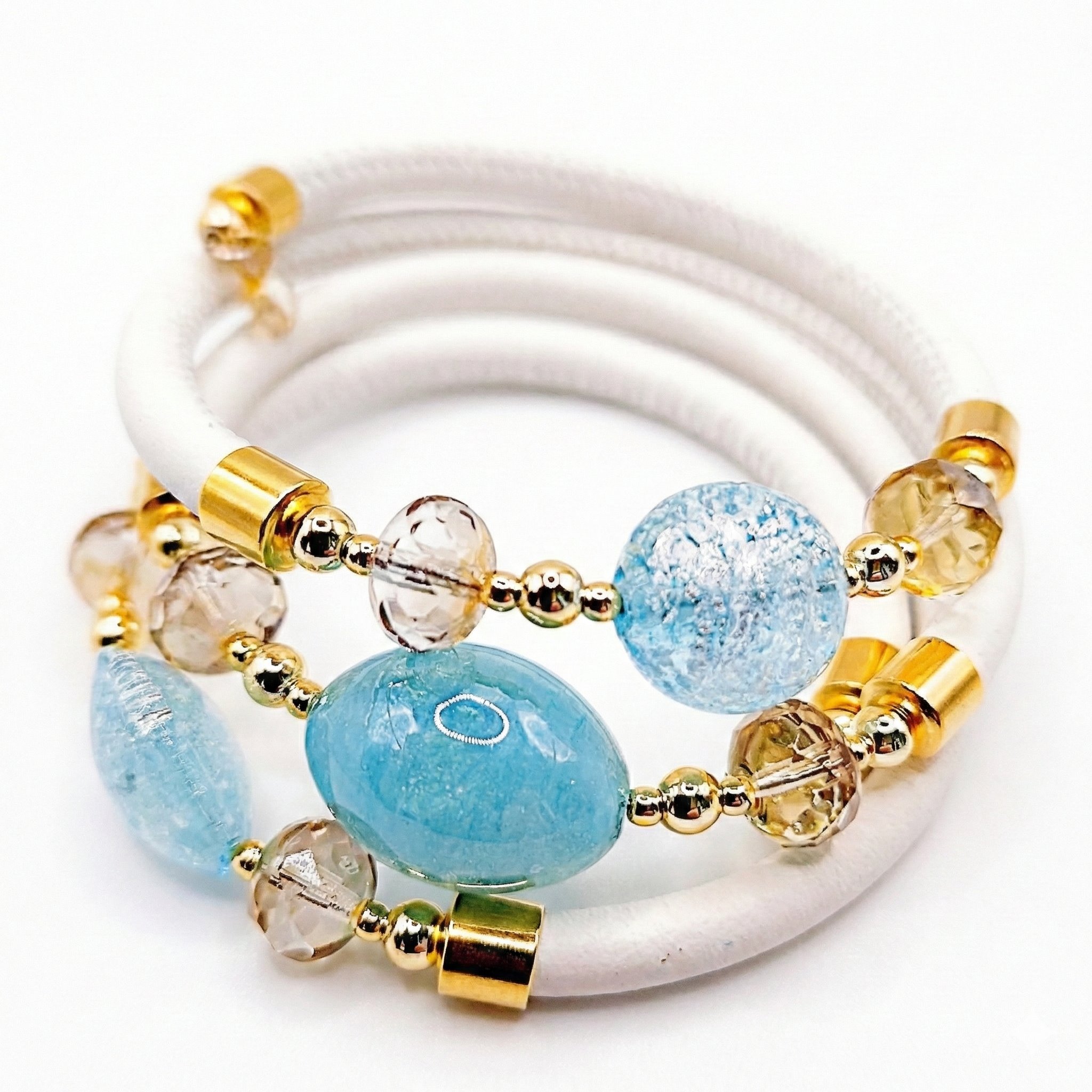 Muránói üveggyöngyökkel díszített karkötő, eredeti toszkán bőrszíjjal, melyet Swarovski kristályok tesznek még ragyogóbbá. Made in Italy.