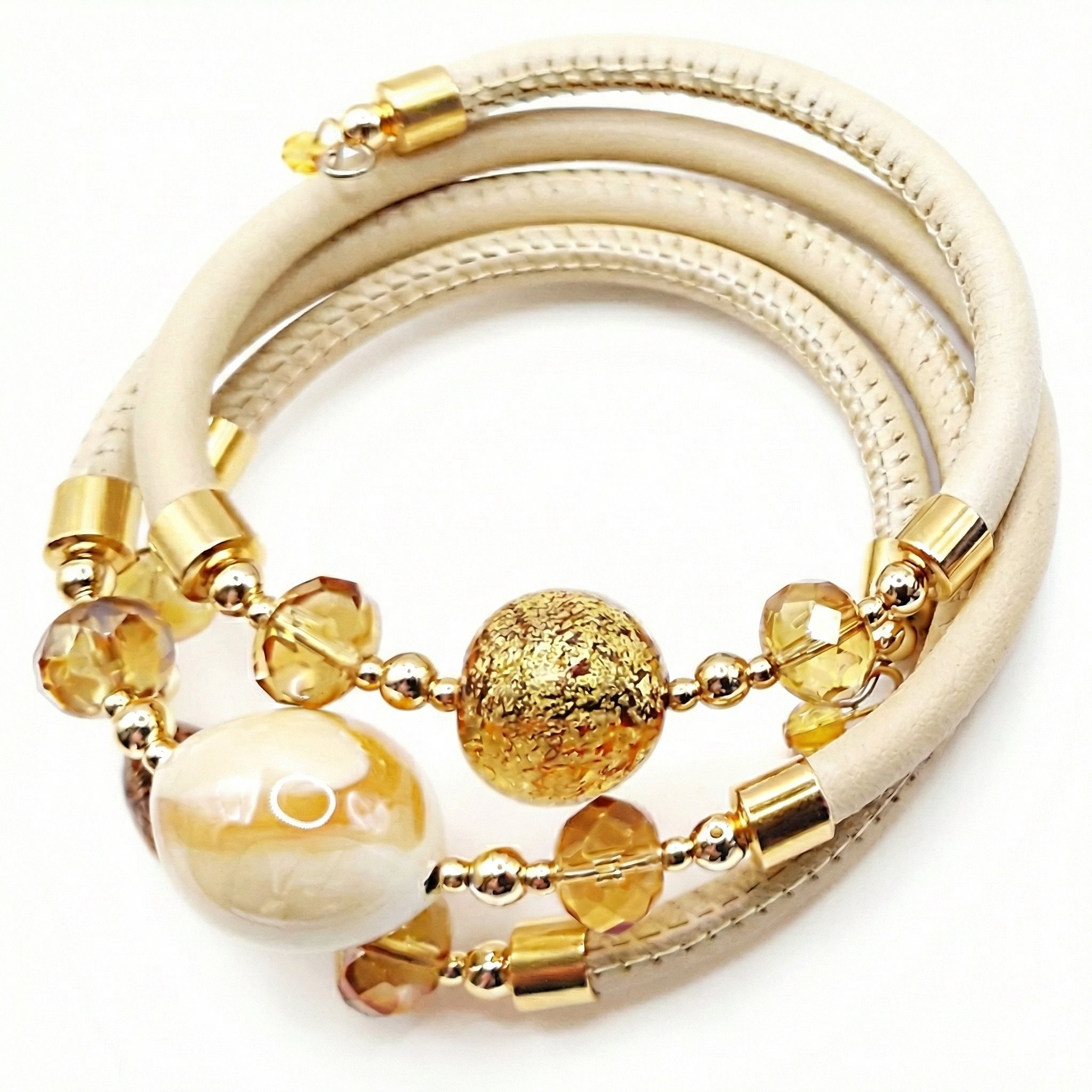 Muránói üveggyöngyökkel díszített karkötő, eredeti toszkán bőrszíjjal, melyet Swarovski kristályok tesznek még ragyogóbbá. Made in Italy.