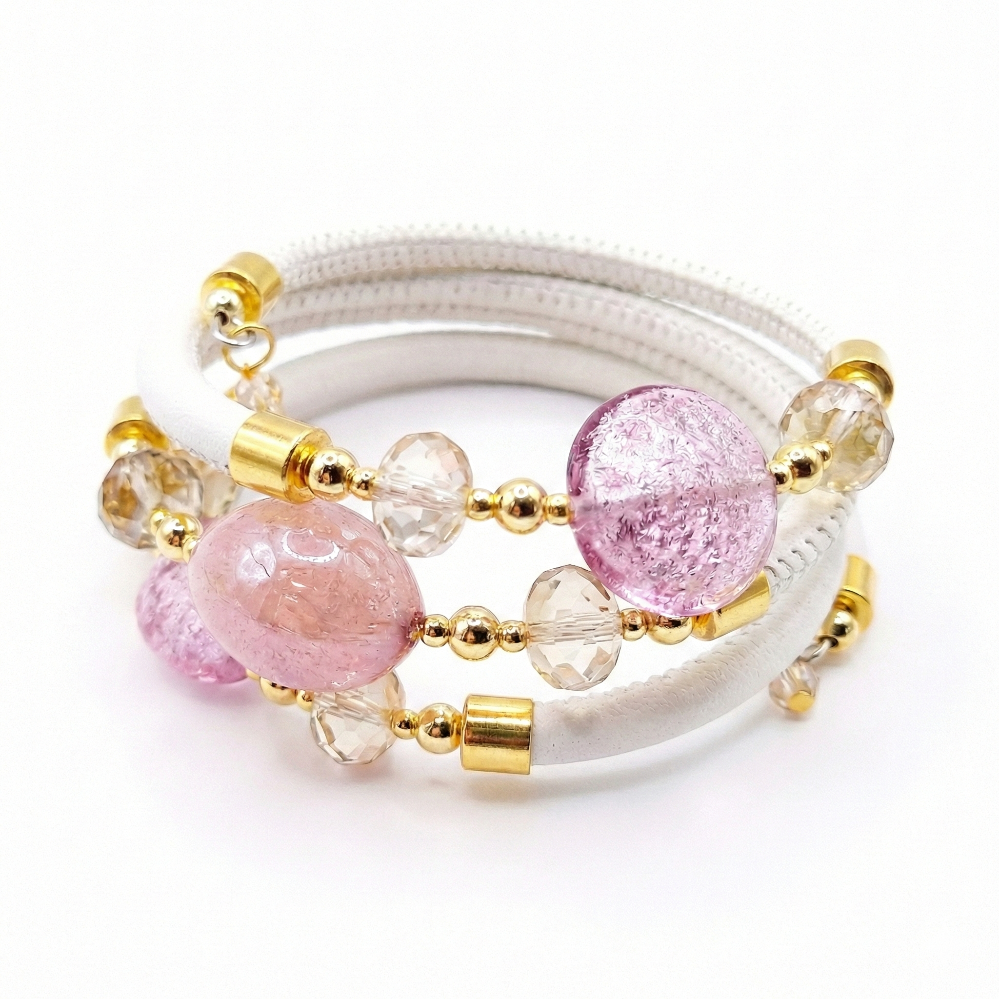 Muránói üveggyöngyökkel díszített karkötő, eredeti toszkán bőrszíjjal, melyet Swarovski kristályok tesznek még ragyogóbbá. Made in Italy.